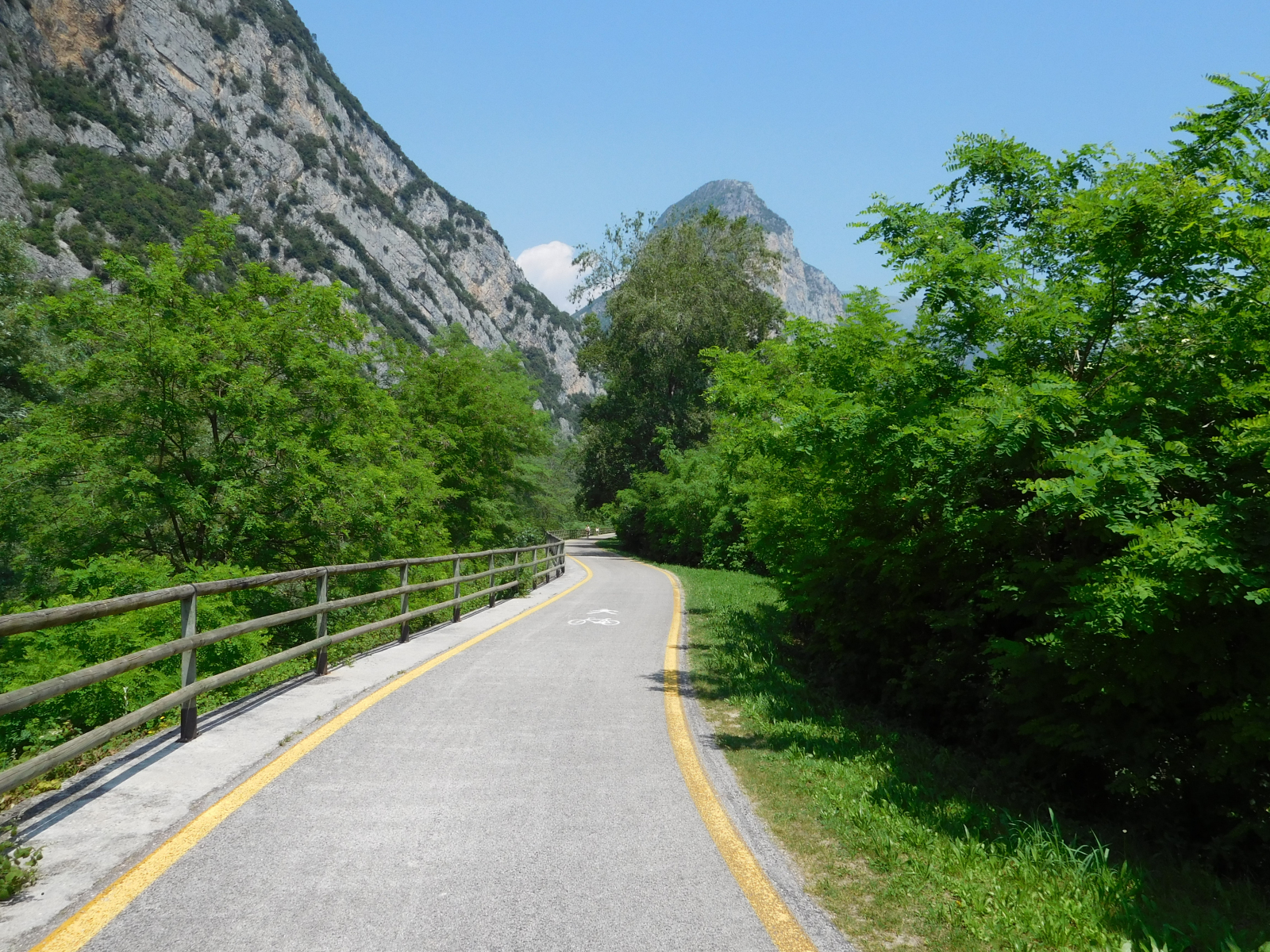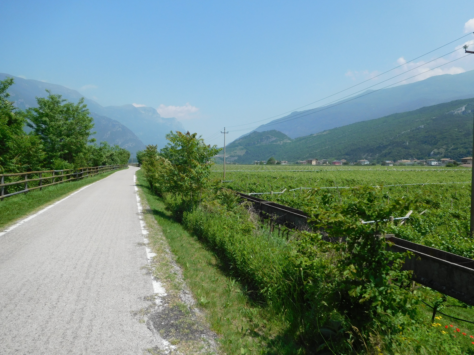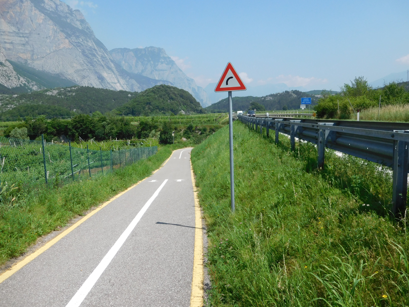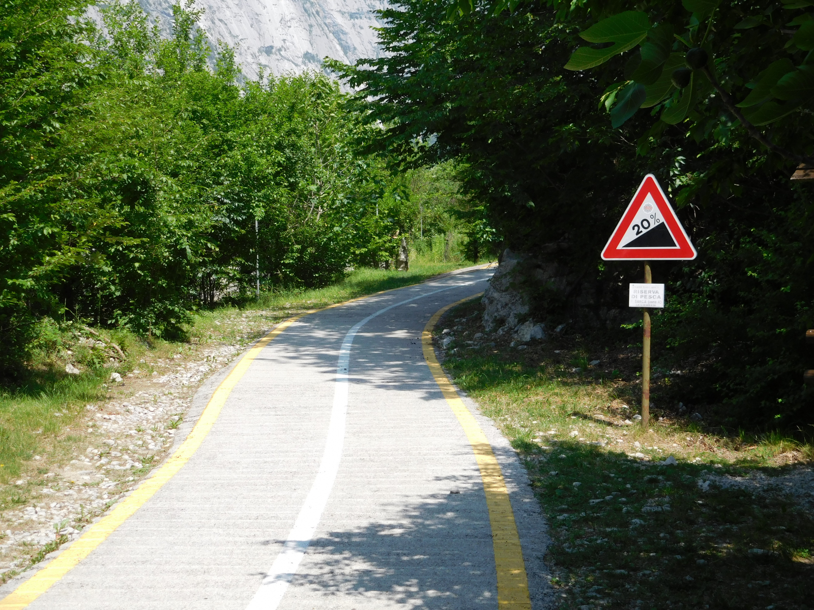 Parto da Verona non tanto presto quanto avrei voluto, per raggiungere Arco, mi sistemo rapidamente in hotel, sistemo la bici e parto. Finalmente, dopo una primavera stentata, la giornata è prettamente estiva, con un bel sole caldo. La città di Arco è ben dotata di ciclabili per cui imbocco quella che mi porta verso nord, a prendere quella che effettivamente affianca il Sarca, da li la ciclabile è su banchina isolata con due corsie, a volte un po’ troppo strette che possono diventare fonte di pericolo quando si incrociano ciclisti più sportiveggianti. La strada è comunque piacevole, il fondo perfetto ed il panorama accattivante, mentre si affiancano vigneti e coltivazione di frutta (credo fossero susine), si alternano saliscendi dolci che non offrono particolari problemi. Si procede in assoluta sicurezza e tranquillità, con l’unico punto degno di segnalazione in una rampa in cemento con una pendenza del 20% (a giudicare dal cartello) dopo circa 10.5km.