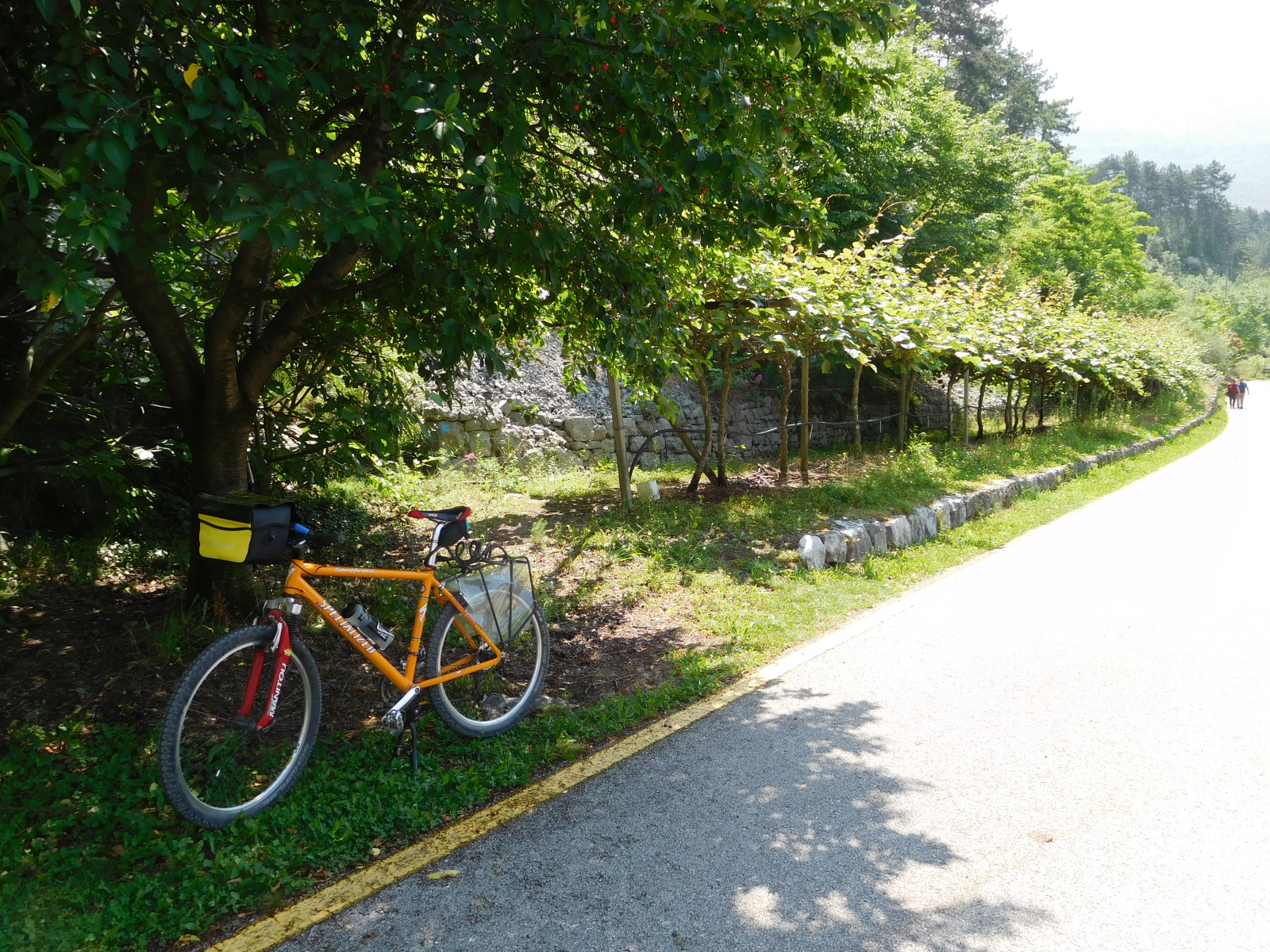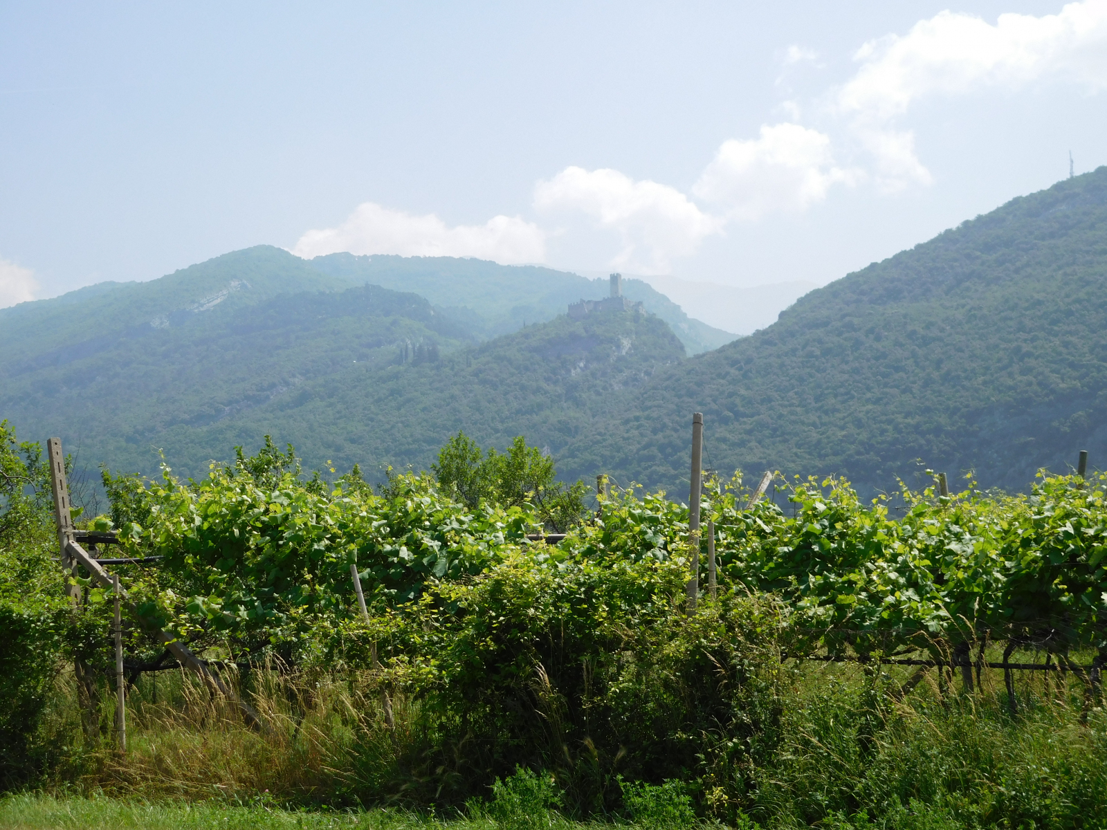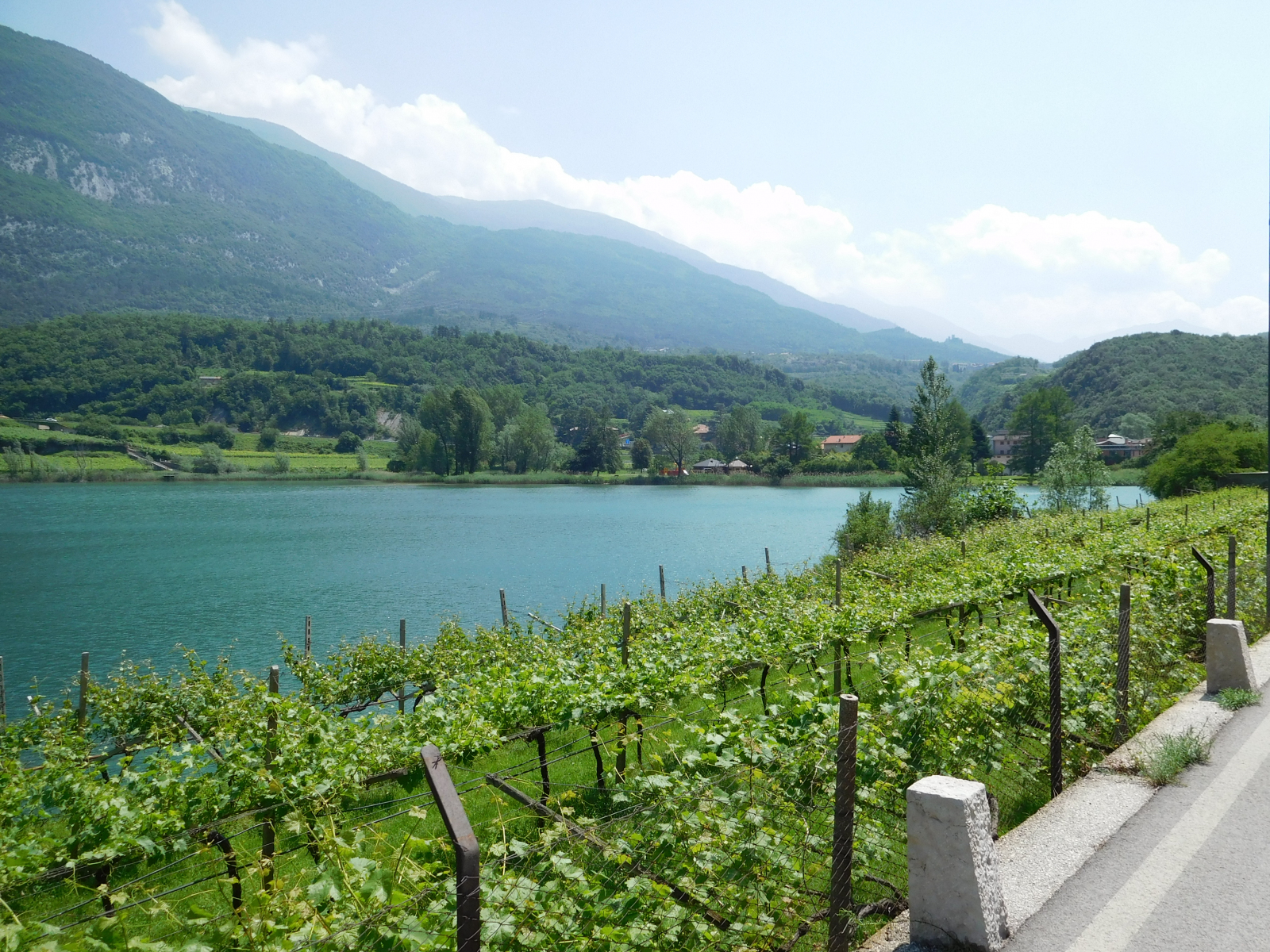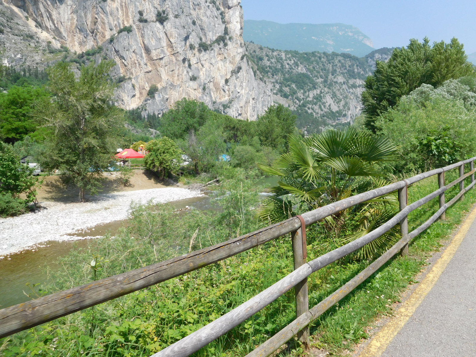 Parto da Verona non tanto presto quanto avrei voluto, per raggiungere Arco, mi sistemo rapidamente in hotel, sistemo la bici e parto. Finalmente, dopo una primavera stentata, la giornata è prettamente estiva, con un bel sole caldo. La città di Arco è ben dotata di ciclabili per cui imbocco quella che mi porta verso nord, a prendere quella che effettivamente affianca il Sarca, da li la ciclabile è su banchina isolata con due corsie, a volte un po’ troppo strette che possono diventare fonte di pericolo quando si incrociano ciclisti più sportiveggianti. La strada è comunque piacevole, il fondo perfetto ed il panorama accattivante, mentre si affiancano vigneti e coltivazione di frutta (credo fossero susine), si alternano saliscendi dolci che non offrono particolari problemi. Si procede in assoluta sicurezza e tranquillità, con l’unico punto degno di segnalazione in una rampa in cemento con una pendenza del 20% (a giudicare dal cartello) dopo circa 10.5km.