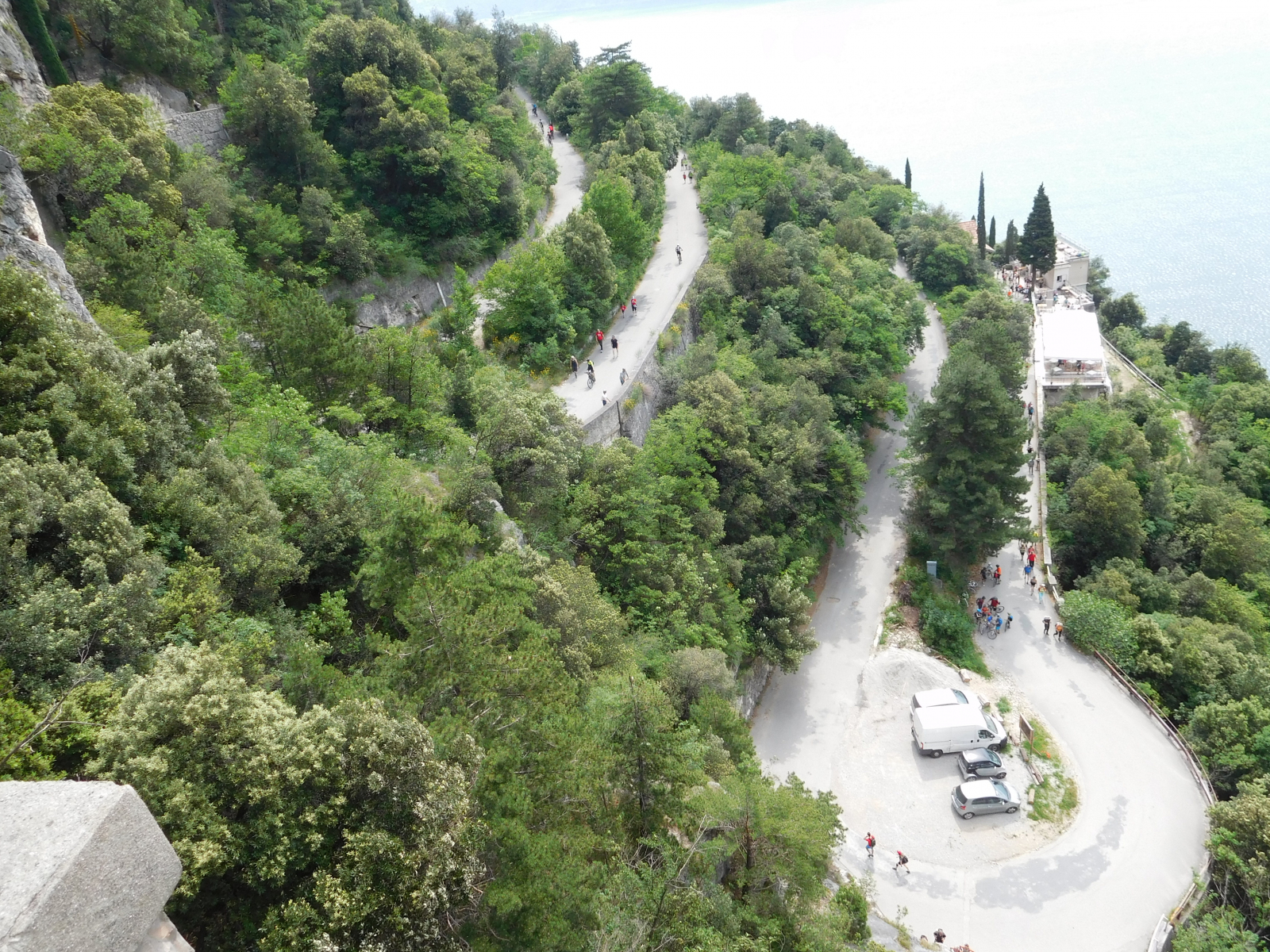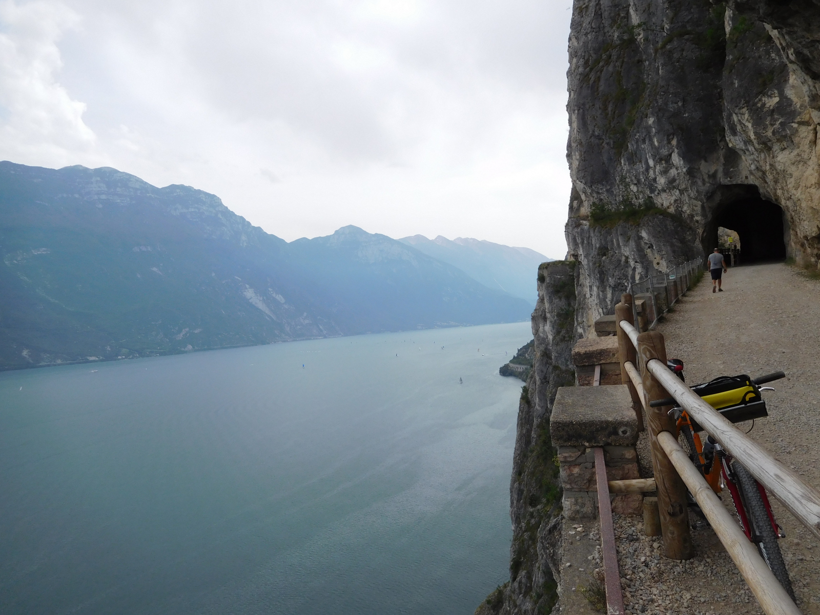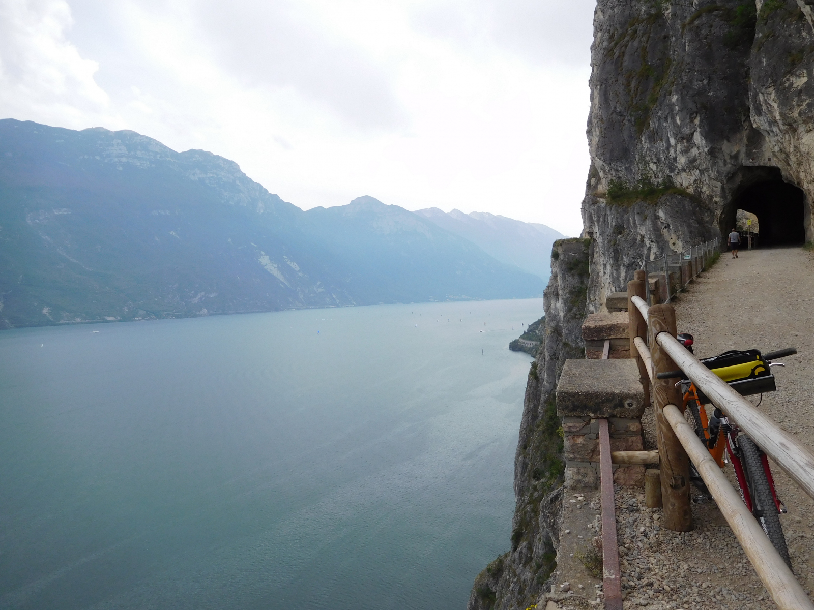 Dopo dopo si passa dall’asfalto allo sterrato, ma è un fondo compatto anche se presenta dei sassi liberi, ma non è mai particolarmente problematico e si sale piuttosto agevolmente. La pendenza è pressochè costante e pedalabile e le gallerie offrono momenti di refrigerio nelle giornate accaldate com’era domenica, per cui ottime per una pausa. Gli scorci che si vedono del lago sono notevoli, ogni poche decine di metri viene voglia di fermarsi per una fotografia o per poggiare gli occhi su panorami che cambiano con il variare dell’altitudine e della posizione. Io ho trovato parecchia gente, e temo che con l’avanzare dell’estate la situazione non possa far altro che peggiorare, ma i cartelli indicano come i pedoni debbano stare a sinistra mentre i ciclisti a destra, tenendo a volte fisicamente separati i percorsi.